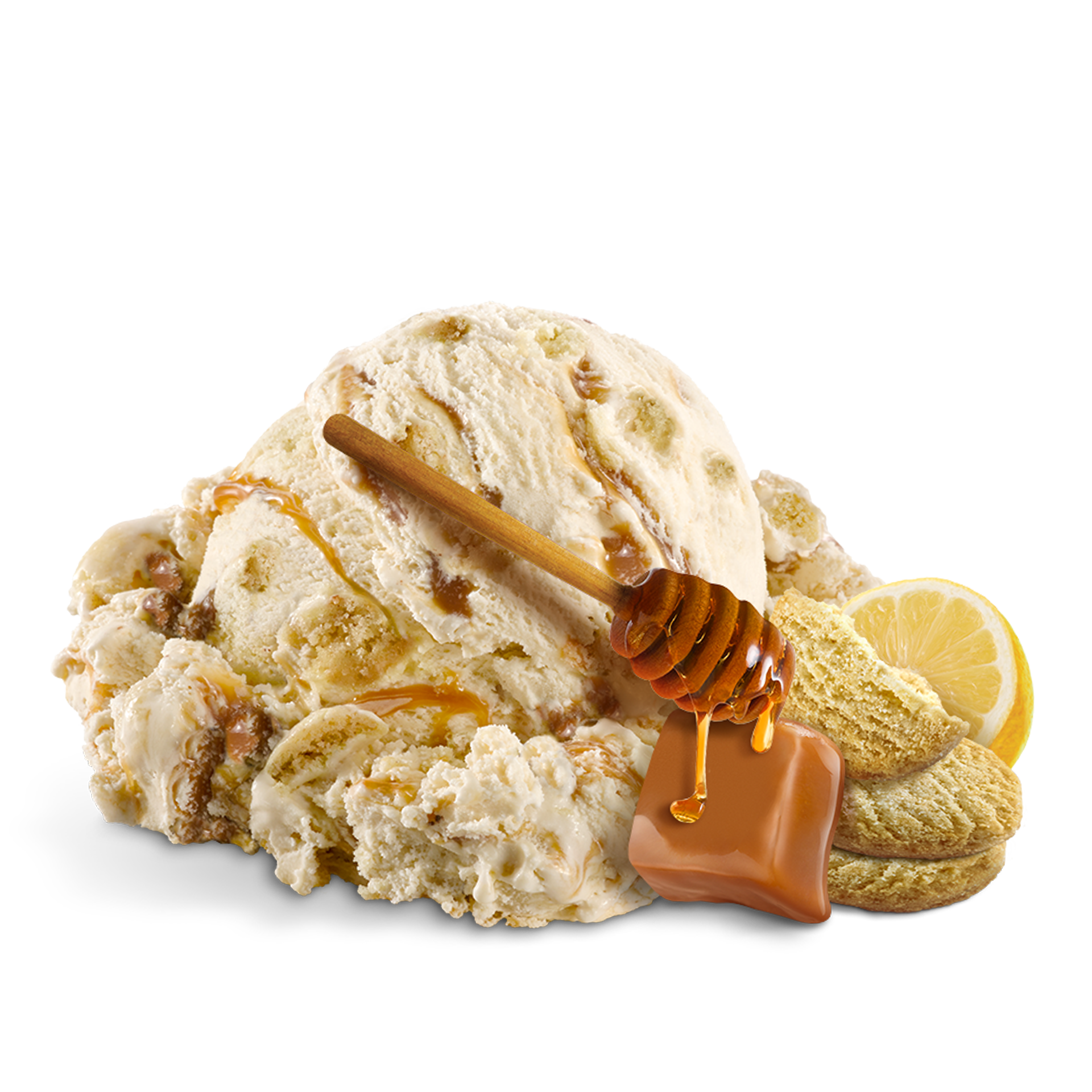 Cremiges Zitronen-Eis mit einem Honig-Karamell-Strudel und Zitronen-Keksen